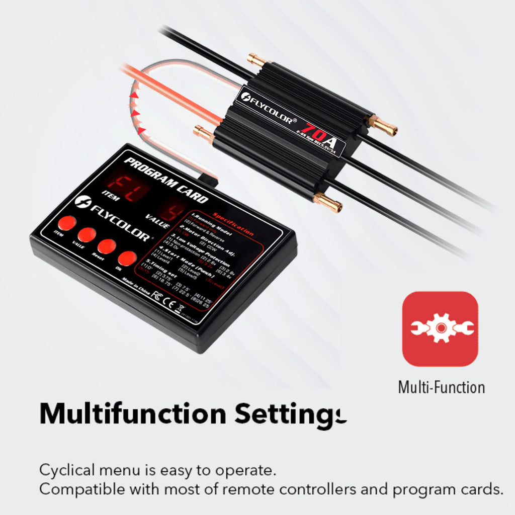 FlyMonster-70A uses a powerful & high-performance MCU. Users can set functions as their demand and fully embody Intelligent characteristics. Unique circuit design, strong anti-interference.