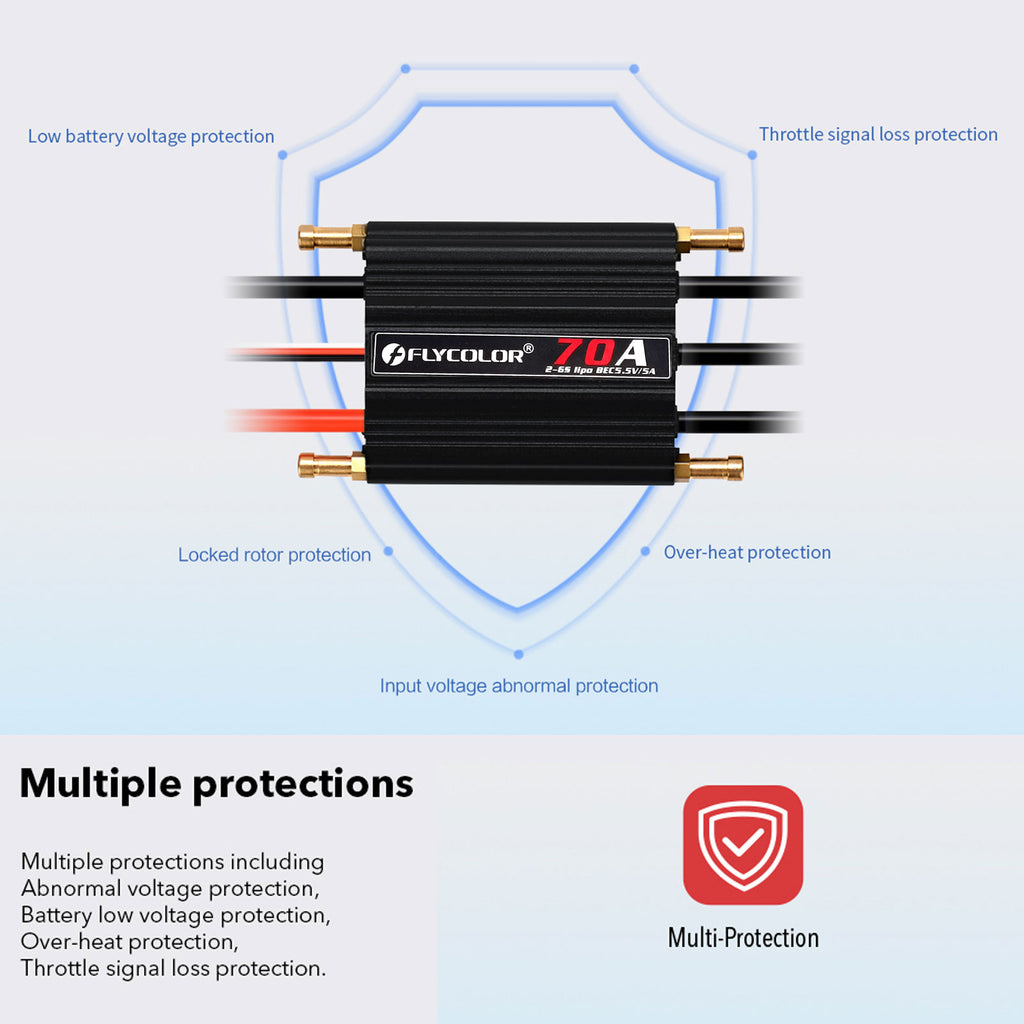 Waterproof design, Multiple protection functions: input voltage abnormal protection/ low-voltage cutoff protection, over-thermal protection and throttle signal loss protection, make the ESC more reliable.